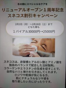 スネコスと、フェイシャルトリートメントがお得に受けていただけます。2月いっぱいの施術に限りますので、ぼちぼち予約を始めていただければと思います。